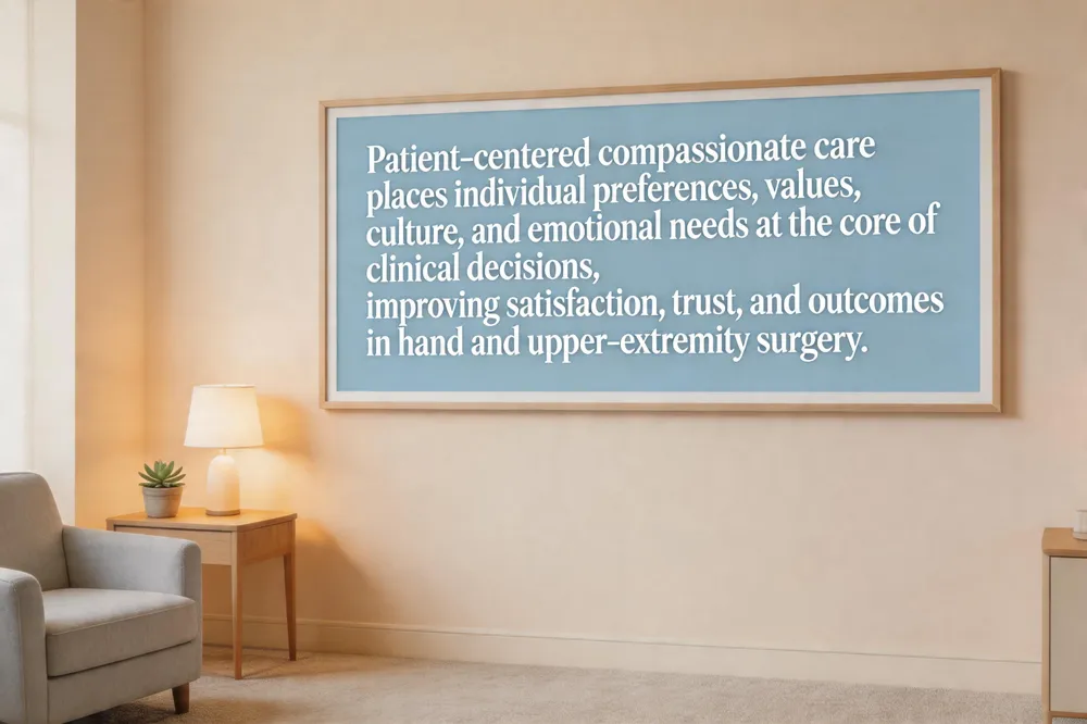Patient‑centered compassionate care blends shared decision‑making, respect for values, and active listening with emotional support that reduces anxiety and boosts trust. Its core principles—transparent communication, empathy, individualized education, and coordinated multidisciplinary follow‑up—directly address the biopsychosocial needs of hand‑surgery patients, enhancing adherence to therapy and accelerating tissue repair. A growing body of research shows that surgeons who practice compassion achieve up to 30% faster functional return, 12% fewer postoperative complications, and 20% lower emergency‑department visits after wrist and hand procedures. Neuro‑immunologic studies link reduced cortisol and improved wound healing to compassionate interactions, while systematic reviews report higher patient‑reported outcome scores and lower opioid consumption when empathy is embedded in orthopedic care.