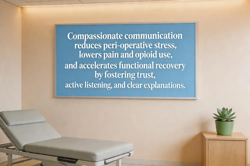Why is compassionate care important in orthopedic patient treatment? It reduces peri‑operative stress, a known inhibitor of wound healing, and encourages patients to follow rehabilitation plans, leading to quicker return of function and higher satisfaction scores.