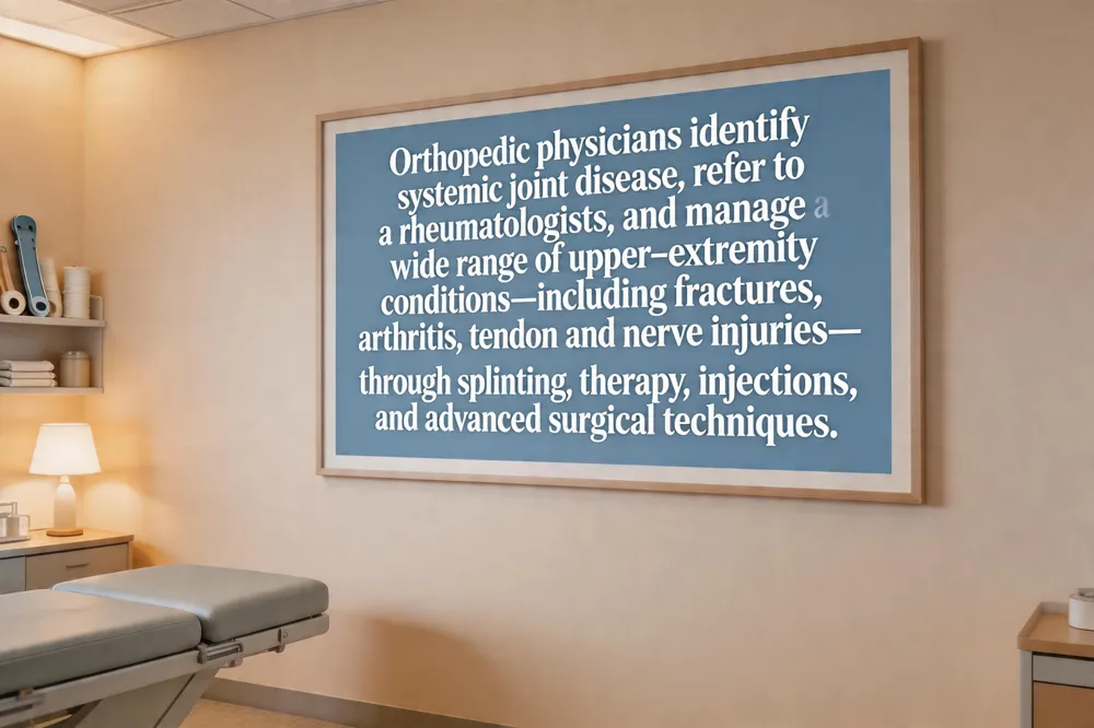 Orthopedic physicians often first notice systemic joint disease. They detect swelling, warmth, and stiffness suggestive of rheumatoid arthritis and can order ESR, CRP, rheumatoid factor, anti‑CCP, and imaging. While rheumatologists confirm the diagnosis and manage long‑term therapy, early orthopedic identification and referral speed treatment and help prevent joint damage.